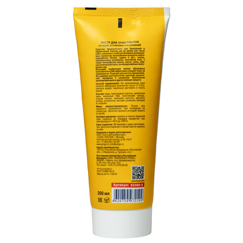 Форма выпуска: паста Объем: 200 мл Тип ДСИЗ: очищение Назначение: для рук, универсальный Вид средства: очищающее Вид абразива: искусственный Эффект от использования: очищение Наличие абразивных частиц: да pH: 7 Соответствует требованиям стандарта: ГОСТ 31696-2012, ТР ТС 019/2011 Тип крышки: крышка Упаковка: туба