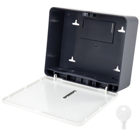 Антивандальный корпус изготовлен из ударопрочного ABS-пластика. Диспенсер обеспечивает высокий уровень гигиены и комфортную подачу полотенец. Имеется окошко для контроля остатка полотенец. Сочетается с расходными материалами других производителей. Оборудован самозахлопывающимся замком с ключом. В комплект входят крепежные материалы для установки.