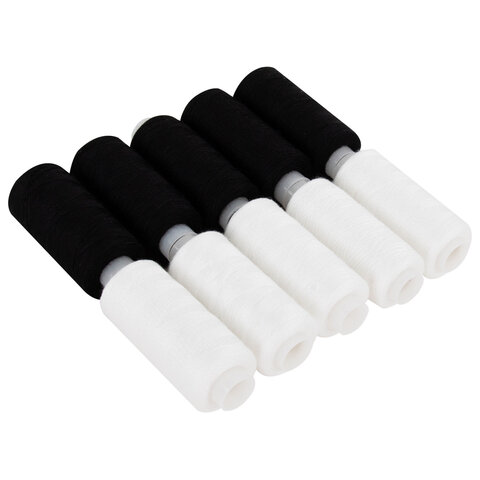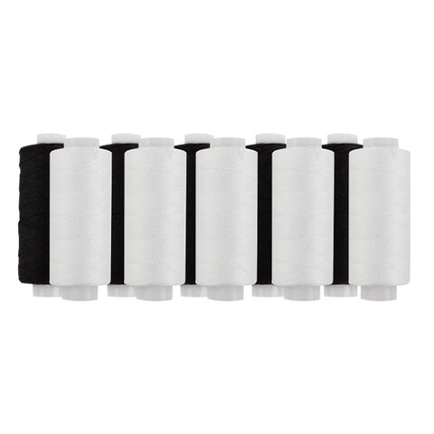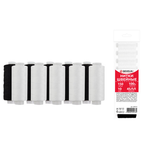 Нитки швейные 45 ЛЛ, 150 м, полиэстер, НАБОР 10 штук, 5 белых / 5 черных, DEVELIA (Девелиа), 609619