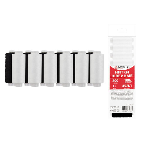 Нитки швейные 40 ЛШ, 200 м, полиэстер, НАБОР 20 шт., белый/черный, в ПОДАРОК иглы, DEVELIA...