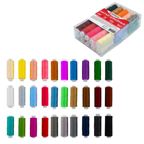 Тип ниток: 40/2 Серия: Швейные Количество цветов: 30 Количество в комплекте: 30 шт. Длина намотки: 200 м Особенности: армированные Материал ниток: 100% полиэстер Комплектация: иглы Цвет: ассорти