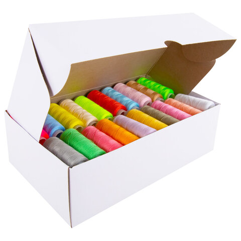 В набор входит 60 катушек 40/2 различных цветов (пастельные, яркие, темные) в намотке 200 м. Поставляются в пластиковом прозрачном боксе с крышкой.