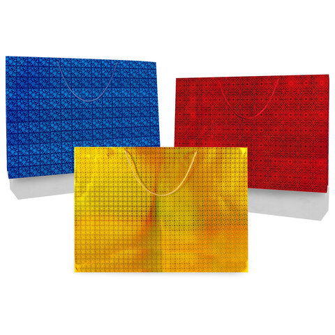 Голографический пакет изготовлен из мелованной бумаги с веревочными ручками из полипропилена и представлен в трех цветах и дизайнах. Выполнен в красном, золотистом и синем цветах. Размер – 70x16x50 см.