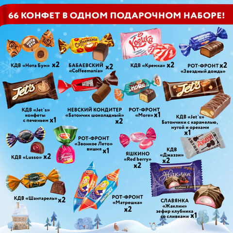 Тип товара: новогодний подарок Упаковка: картонная коробка Масса нетто: 1000 г Количество конфет в наборе: 66 шт. Дизайн: ОЧАРОВАНИЕ ХОЛОДА Производитель: Мосупак Срок годности: 6 мес. Высота: 20 см Ширина: 22.5 см Глубина: 10 см