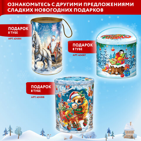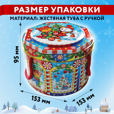 Новогодний подарок "КАРУСЕЛЬ" МОСУПАК – это сладости в жестяной упаковке с новогодним дизайном. Упаковка имеет удобную ручку для переноски. 600 г вкуснейших кондитерских изделий популярных торговых марок обязательно придутся по вкусу всем сладкоежкам!