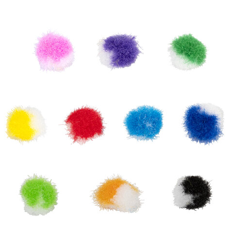 Изготовлены из качественного полиэстера и могут использоваться как взрослыми, так и детьми старше 3 лет. Помпоны двухцветные: одна часть помпона белая, а другая выполнена в одном из 10 ярких цветов. Диаметр – 8 мм. Поставляются в пакете с европодвесом в количестве 100 штук.