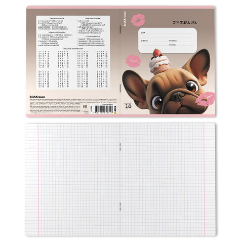 Тетрадь школьная ученическая формата А5. Обложка из высококачественного мелованного картона плотностью 170 г/м2. Отделка обложки – выборочный УФ-лак. В блоке 18 листов в клетку с полями. Бумага офсетная плотностью 60 г/м2. Цвет линовки – синий. Скругленные уголки обложки и блока. Тип скрепления – скоба. Тетради разного дизайна упакованы в термоусадочную пленку по 10 штук.