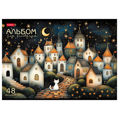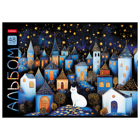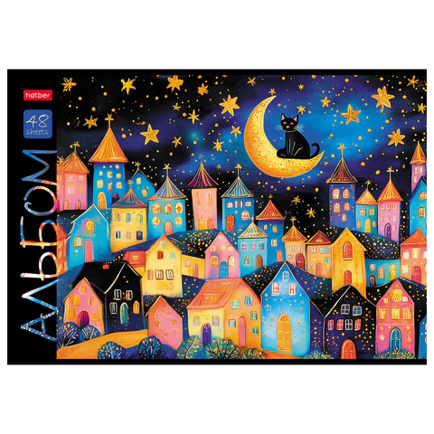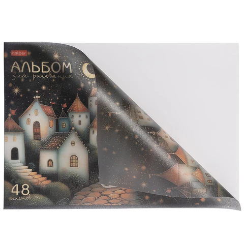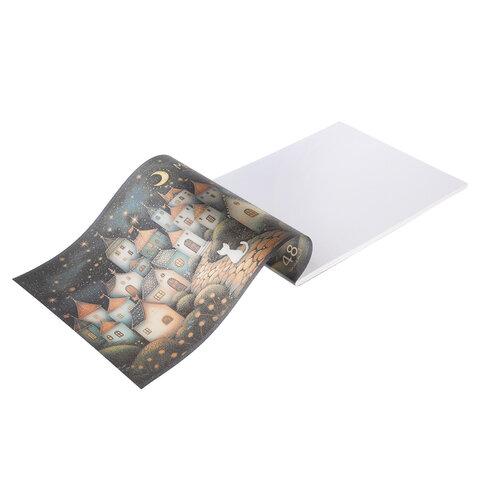 Альбом А4 формата, на скобе. Внутренний блок содержит 48 листов, офсетная бумага плотностью 100 г/м2. Обложка изготовлена из высококачественного пластика.