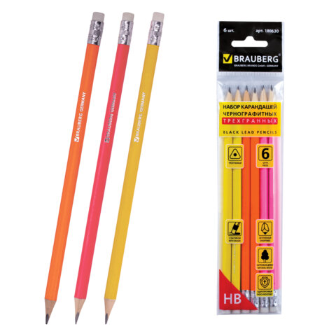 Карандаши чернографитные BRAUBERG НАБОР 6 шт., НВ, трехгранные, с резинкой, корпус ассорти,...