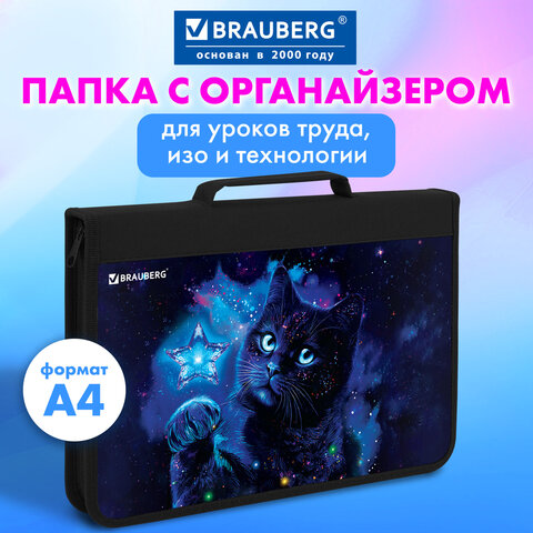 Папка на молнии BRAUBERG с ручкой и органайзером. Внутри папки – крепления для канцелярских и письменных принадлежностей. Застежка-молния расположена по периметру папки.
