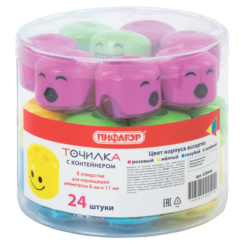 Эргономичный корпус в форме смайлика выполнен из пластика. Точилка оснащена двумя отверстиями для заточки карандашей разного диаметра. Острое стальное лезвие обеспечивает быструю и легкую заточку. Карандаш затачивается аккуратно, а опилки остаются в специальном контейнере. Размер: 37х38х38 мм.