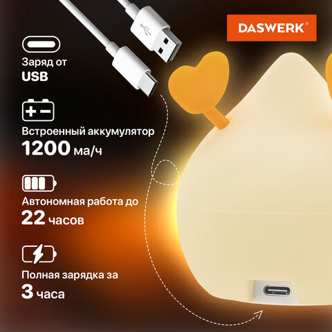 Силиконовый ночник DASWERK в очаровательном дизайне мягко рассеивает свет, создавая тёплую и спокойную атмосферу в любой комнате – будь то детская, спальня или гостиная. Корпус из приятного на ощупь силикона безопасен для самых маленьких, не нагревается и устойчив к деформации, поэтому его можно использовать даже как антистресс-игрушку.