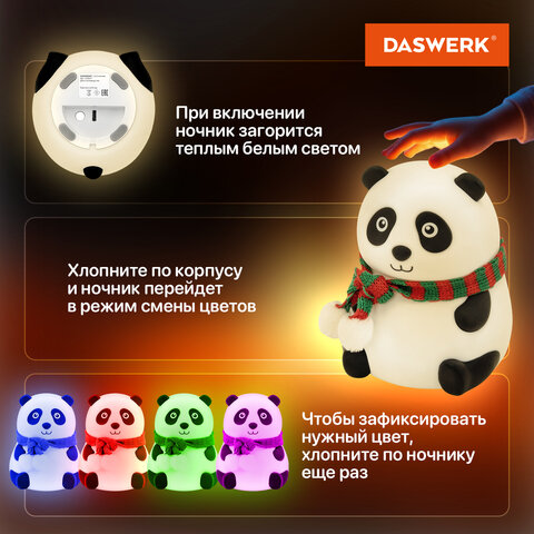 Силиконовый ночник DASWERK в очаровательном дизайне мягко рассеивает свет, создавая тёплую и спокойную атмосферу в любой комнате – будь то детская, спальня или гостиная. Корпус из приятного на ощупь силикона безопасен для самых маленьких, не нагревается и устойчив к деформации, поэтому его можно использовать даже как антистресс-игрушку. Если легко стукнуть по ночнику, он поменяет цвет.