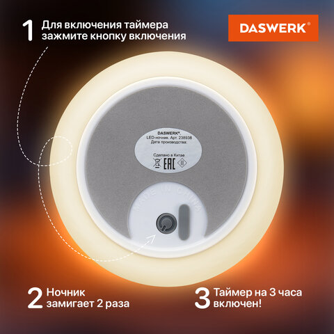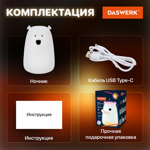 Силиконовый ночник DASWERK в очаровательном дизайне мягко рассеивает свет, создавая тёплую и спокойную атмосферу в любой комнате – будь то детская, спальня или гостиная. Корпус из приятного на ощупь силикона безопасен для самых маленьких, не нагревается и устойчив к деформации, поэтому его можно использовать даже как антистресс-игрушку. Если легко стукнуть по ночнику, он поменяет цвет.