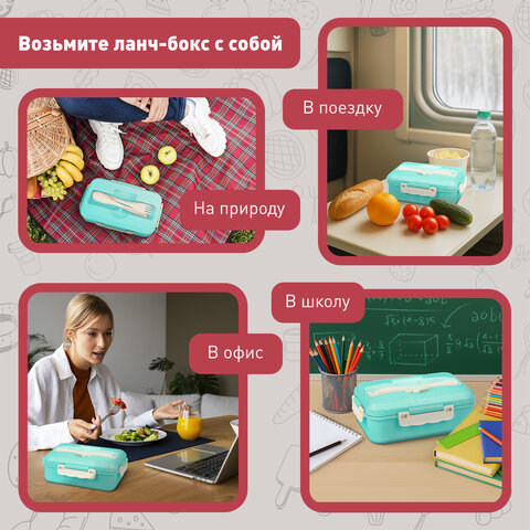 Объём ланч-бокса – 1400 мл, что оптимально для полноценного обеда. Он представляет собой одноуровневую конструкцию с тремя отсеками, идеальными для основного блюда, например, гарнира и мяса, а также для салатов, сэндвичей и снеков. Благодаря продуманной конструкции контейнера блюда в нём сохраняют вкусовые качества и не смешиваются между собой.