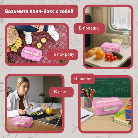 Объём ланч-бокса – 1400 мл, что оптимально для полноценного обеда. Он представляет собой одноуровневую конструкцию с тремя отсеками, идеальными для основного блюда, например, гарнира и мяса, а также для салатов, сэндвичей и снеков. Благодаря продуманной конструкции контейнера блюда в нём сохраняют вкусовые качества и не смешиваются между собой.