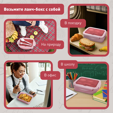 Объём ланч-бокса – 1400 мл, что оптимально для полноценного обеда. Он состоит из двух уровней: первый (700 мл) представляет собой большое отделение для основного блюда, а второй (700 мл) разделён на 3 секции и подойдёт для сэндвичей, закусок, десертов или салата. Благодаря перегородкам продукты не смешиваются между собой. Таким образом, ланч-бокс универсален: его можно использовать как для одного блюда, так и для комбинации из разных блюд.