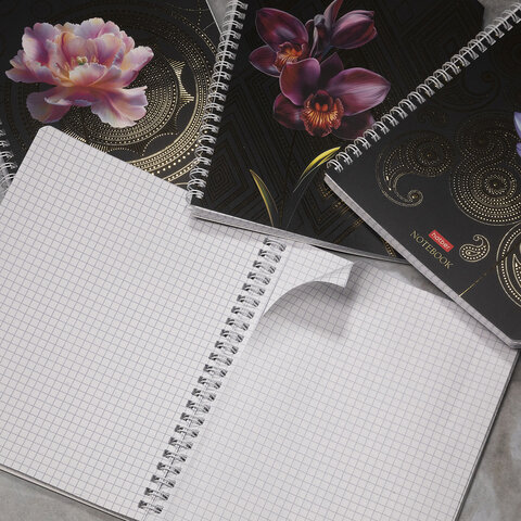 Тетрадь А5 формата, 96 листов. Материал обложки – мелованный картон. Дополнена спецэффектами в виде матовой ламинации, 3D-фольги и 3D-лака. Внутренний блок – офсетная бумага 65 г/м2, клетка. Тип скрепления – гребень. 4 дизайна в блоке. Гребень позволяет раскрывать тетрадь на 360°.